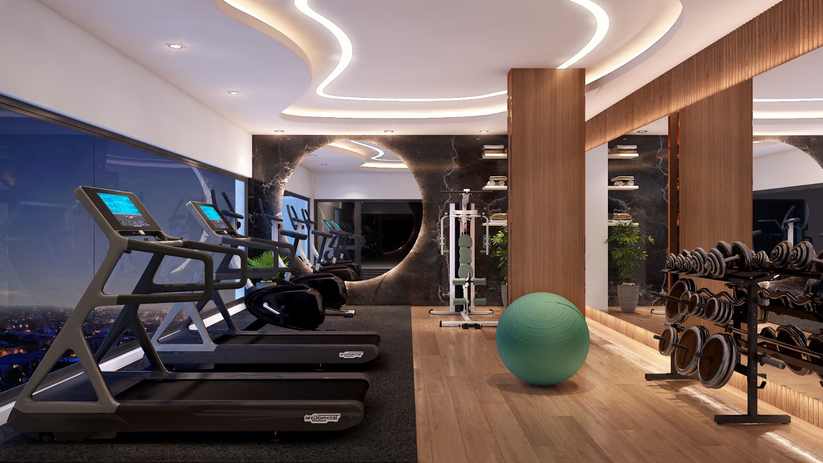 Gym floor: Vitrified flooring with rubber tiles for specific areas