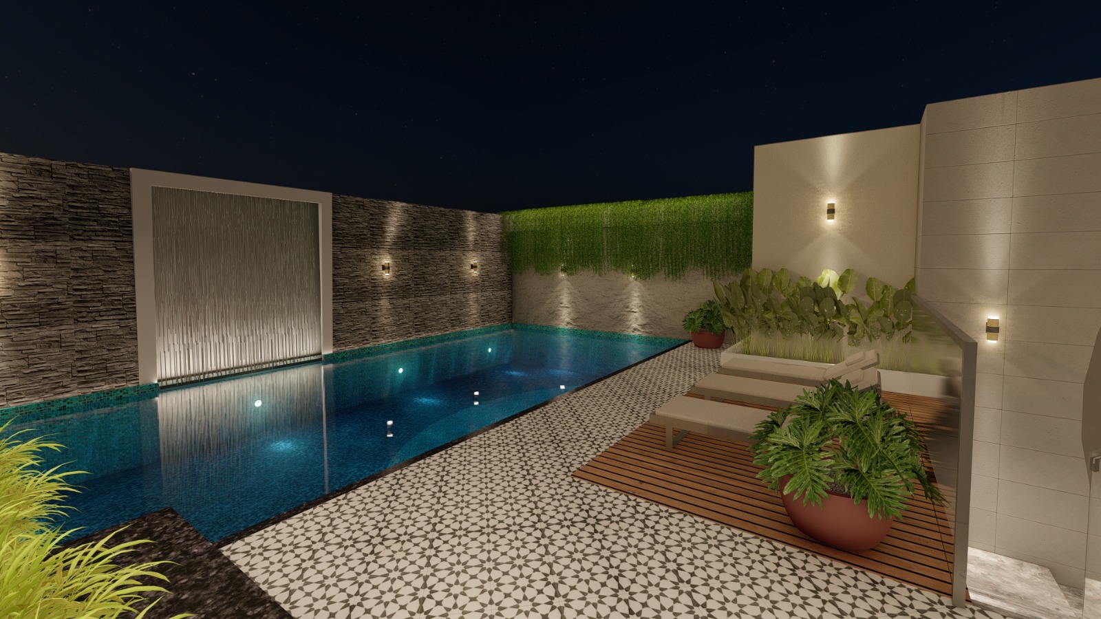 Party area floor / Swimming pool deck: UV & slip-resistant glazed vitrified matte tiles Make will be KERAMICA, KAJARIA, JOHNSON or equivalent